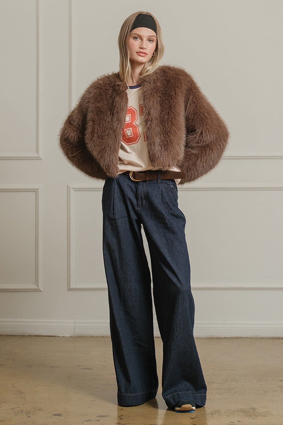 Our Hot Coco Fur Jacket is a winter closet staple! Dress up an otherwise boring white tee with jeans, or wear it over a dress for a winter wedding or holiday party!