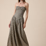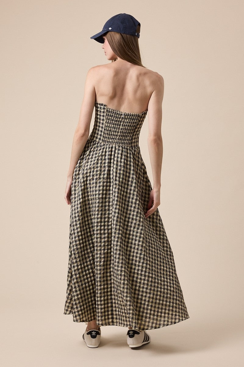 Our Oakley Dress features a strapless silhouette with a sticky grip lining the top, a smocked back for stretch and comfort, and a zipper closure in the back. The print is a natural checker with the main color being black and tan, but with little subtle details of green and blue.